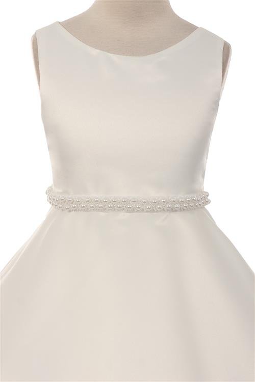 Full A-line satin Communion dress with a beautiful thick pearl trim to accent the waist. Comes with sash in the back to tighten. 100% Polyester Lining: Acetate Lining Tulle Netting: 100% Nylon Zip fastening Ankle Length